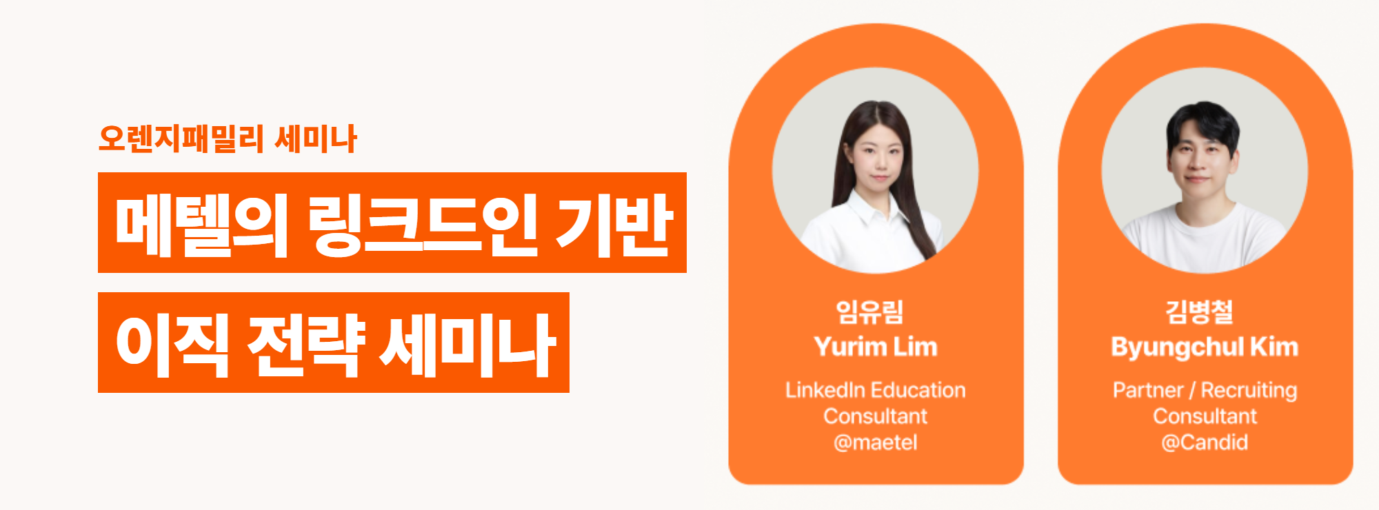 링크드인 교육/컨설팅 전문 스타트업이자 오렌지패밀리 메텔이 스타트업 전문 채용 컨설팅 솔루션 캔디드와 손을 잡고 ‘링크드인으로 준비하는 이직 전략 세미나’를 개최합니다. 하반기 채용 트렌드 인사이트부터 링크드인을 통한 이직 꿀팁까지, 다양한 정보가 함께하는데요. 9/23(화) 저녁, 디캠프에서 열립니다. 행사에 참여하고 싶으면 Click Here