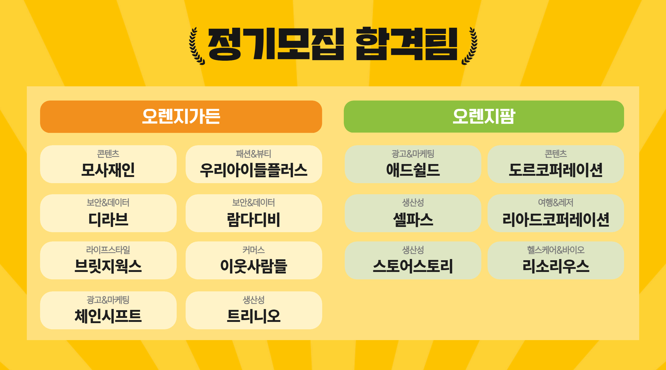 2025 오렌지플래닛 정기모집 합격팀이 공개됐습니다. 이번 정기모집에선 총 14개 팀이 선발됐는데요. 오렌지가든과 오렌지팜 각각 8개, 6개 팀이 선정됐습니다. 오렌지가든은 초기 지원이 필요한 창업 팀으로 6개월간 사무 공간을 포함해 다양한 지원을 받습니다. 오렌지팜은 사업 고도화를 이루고 있는 팀인데요. 12개월간의 사무 공간 지원과 더불어 최대 5억 원의 투자와 후속 투자 유치를 위한 벤처캐피탈(VC) 멘토링, 민간투자주도형기술창업지원(TIPS)와 연계된 투자 기회가 함께합니다. 새로운 합격팀의 미래를 응원합니다!